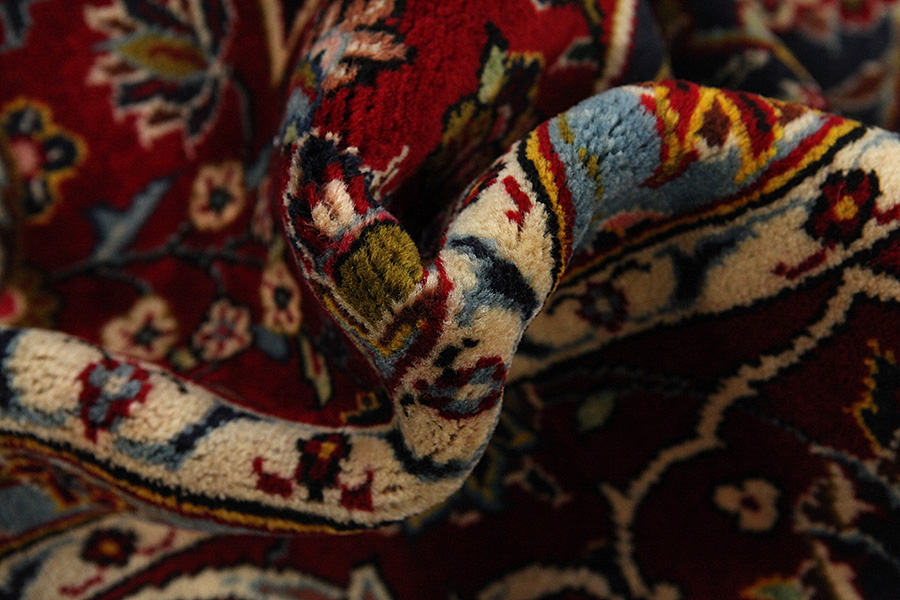 Abrash: Due to the different amount of grease in the wool and the added salt during the process of dyeing, the wool has got a varying colour absorbance. This is not very visible before weaving. During the weaving though, lines of the same colour are formed in the carpet. This is called Abrash (which in Farsi means little cloud) and it shows that the wool was not manufactured using chemical means and marks the naturalness and authenticity of the carpets. Examples