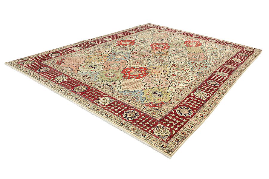 Bakhtiari Carpets : In the mountains Zagros, west of the city of Isfahan, around the town of Shahr-e-Kurd, live the nomads Bakhtiar. Their carpets are known for the design with various repeating squares in which flowers and animals are depicted. For this reason the design is called "garden"(Khesti). Their carpets are very durable with a dense weave and very good quality Persian wool coming from sheep grazing at a high altitude. The best Bakhtiar rugs and carpets with highest knot density are often called Bibibaff. Also in many designs we see influences from Isfahan carpets. (Boldaji - Feridan - Saman).