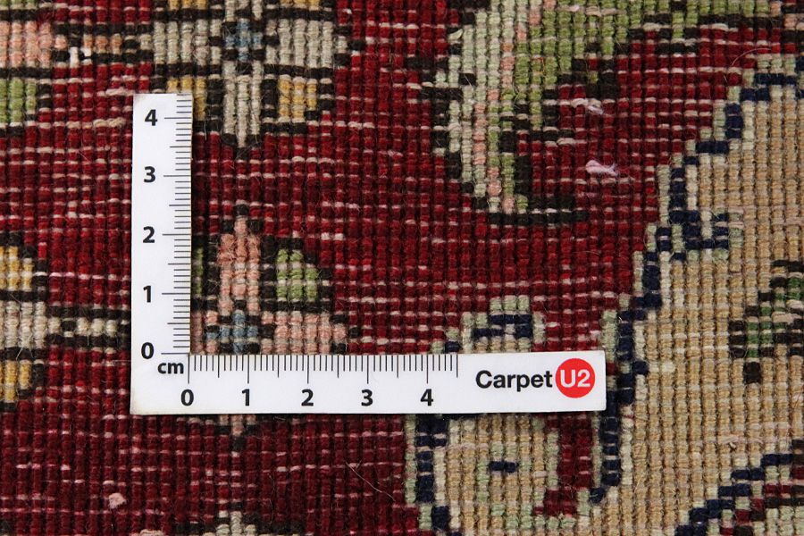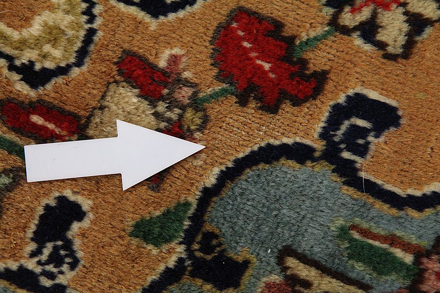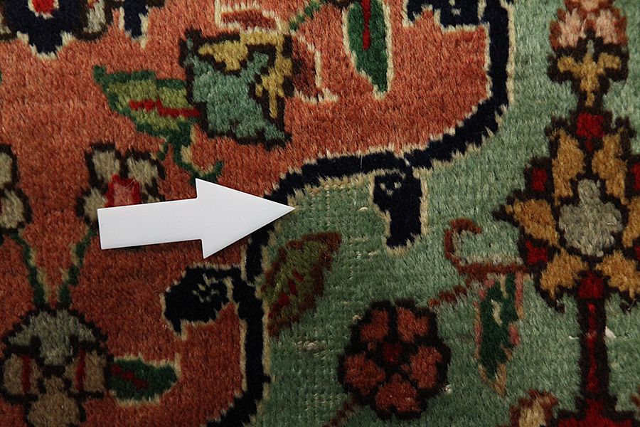 Abrash: Due to the different amount of grease in the wool and the added salt during the process of dyeing, the wool has got a varying colour absorbance. This is not very visible before weaving. During the weaving though, lines of the same colour are formed in the carpet. This is called Abrash (which in Farsi means little cloud) and it shows that the wool was not manufactured using chemical means and marks the naturalness and authenticity of the carpets. Examples