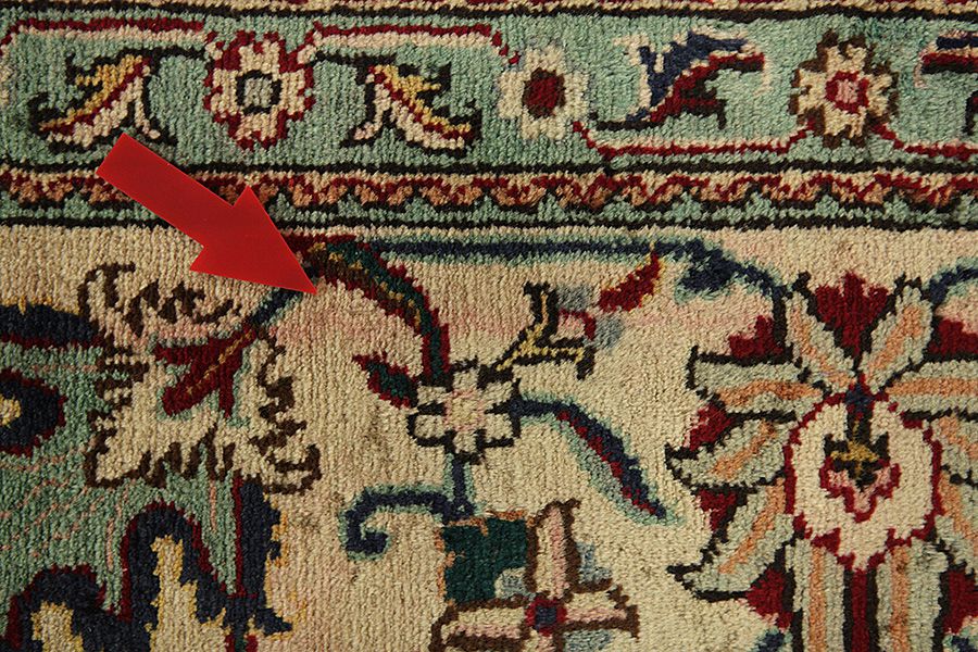 Abrash: Due to the different amount of grease in the wool and the added salt during the process of dyeing, the wool has got a varying colour absorbance. This is not very visible before weaving. During the weaving though, lines of the same colour are formed in the carpet. This is called Abrash (which in Farsi means little cloud) and it shows that the wool was not manufactured using chemical means and marks the naturalness and authenticity of the carpets. Examples