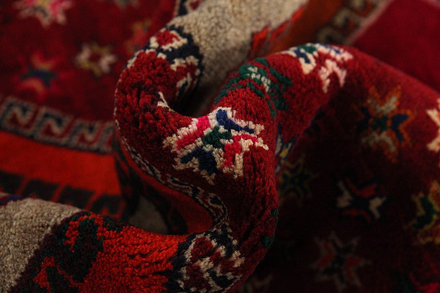 Abrash: Due to the different amount of grease in the wool and the added salt during the process of dyeing, the wool has got a varying colour absorbance. This is not very visible before weaving. During the weaving though, lines of the same colour are formed in the carpet. This is called Abrash (which in Farsi means little cloud) and it shows that the wool was not manufactured using chemical means and marks the naturalness and authenticity of the carpets. Examples