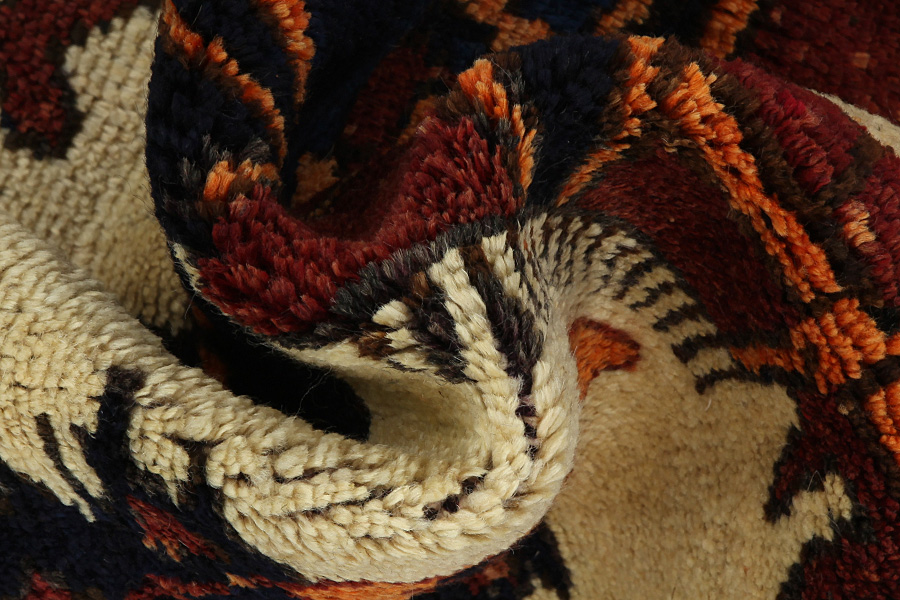 Abrash: Due to the different amount of grease in the wool and the added salt during the process of dyeing, the wool has got a varying colour absorbance. This is not very visible before weaving. During the weaving though, lines of the same colour are formed in the carpet. This is called Abrash (which in Farsi means little cloud) and it shows that the wool was not manufactured using chemical means and marks the naturalness and authenticity of the carpets. Examples