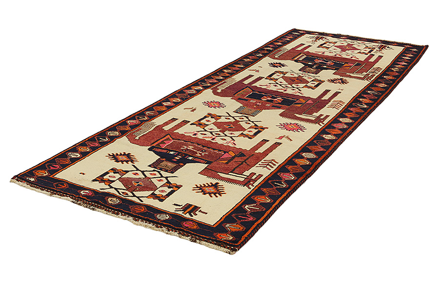 Qashqai Carpets : Qashqai carpets are woven by nomads who live in the mountainous areas of Southwest Persia, the provinces of Fars, Khuzestan, south of Isfahan and around the city Shiraz. Their carpets have a high knot density and a wide variety of designs, usually in deep red and blue colors. They weave carpets, Kilims and decorative textiles (ribbons, bags, etc.), which depict scenes from their lives with various representation of humans, animals, birds, trees and flowers. They also depict historical monuments, mostly from Persepolis.