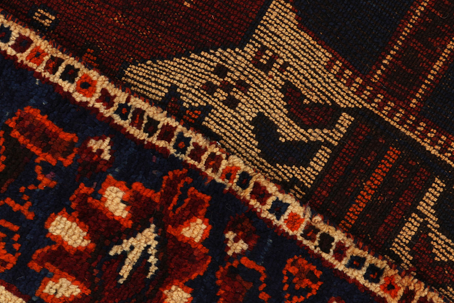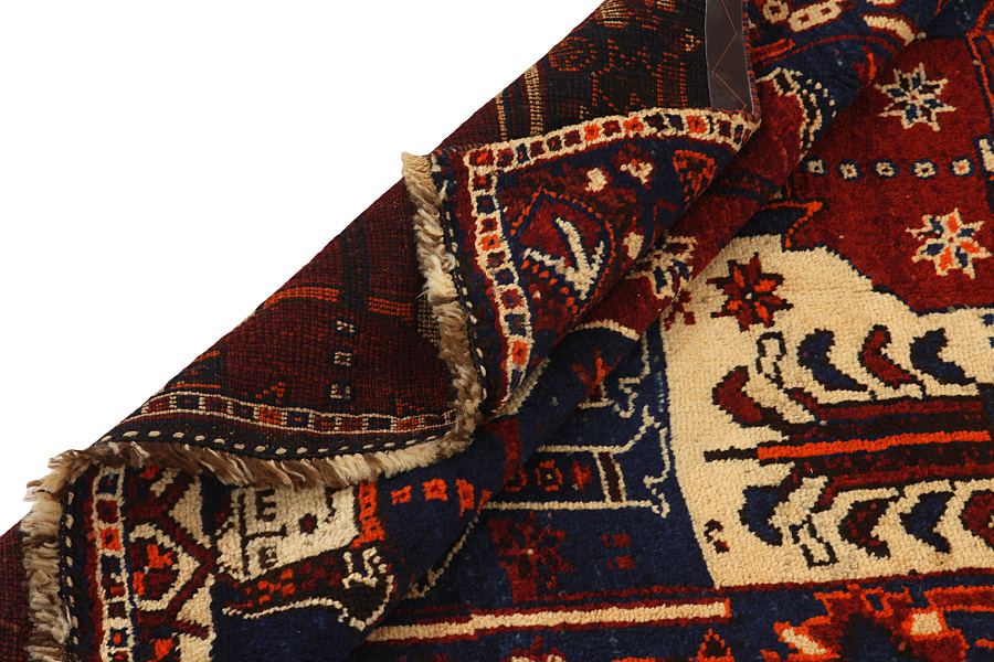 Qashqai Carpets : Qashqai carpets are woven by nomads who live in the mountainous areas of Southwest Persia, the provinces of Fars, Khuzestan, south of Isfahan and around the city Shiraz. Their carpets have a high knot density and a wide variety of designs, usually in deep red and blue colors. They weave carpets, Kilims and decorative textiles (ribbons, bags, etc.), which depict scenes from their lives with various representation of humans, animals, birds, trees and flowers. They also depict historical monuments, mostly from Persepolis.