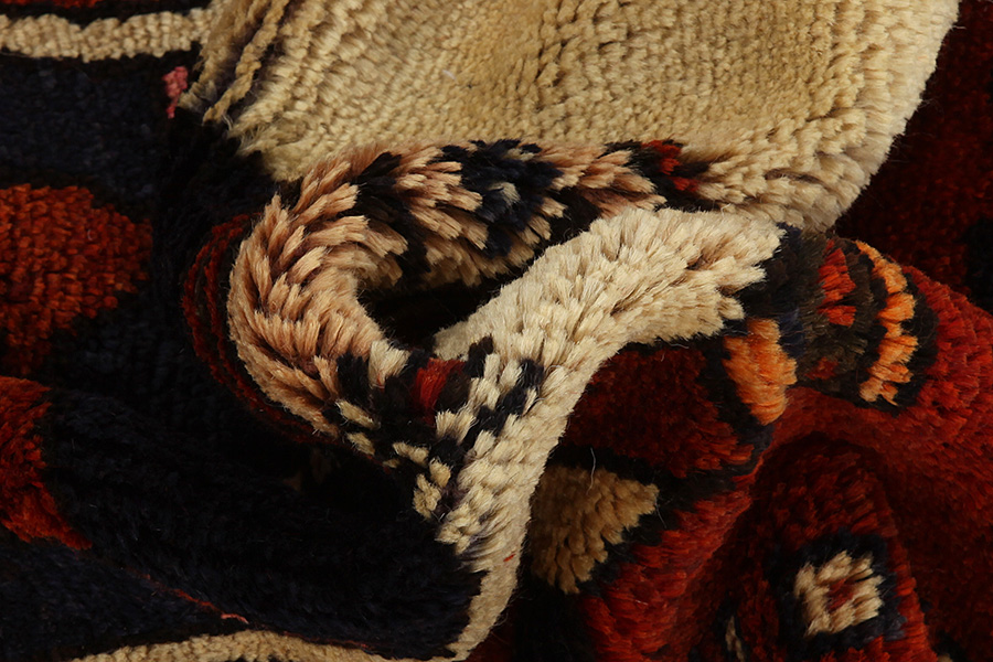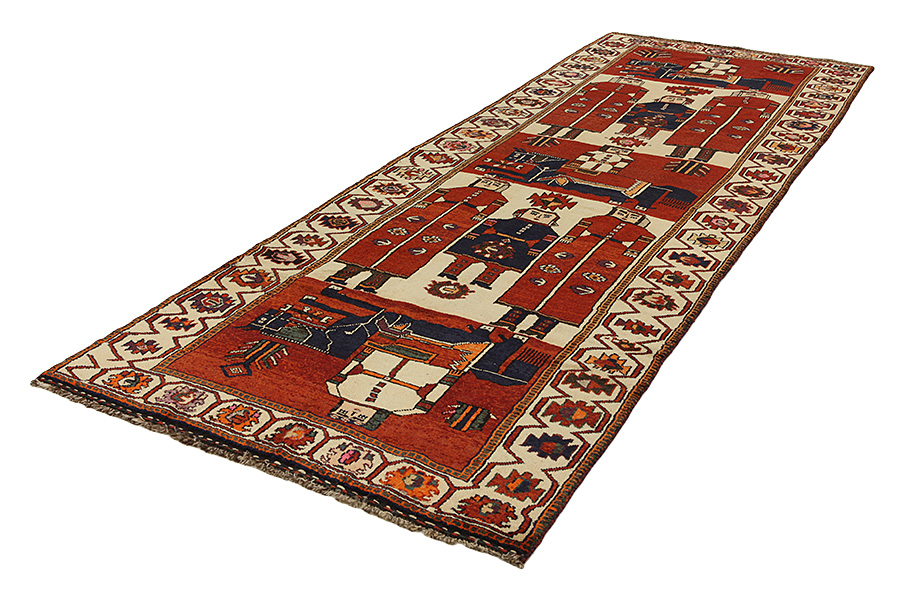Qashqai Carpets : Qashqai carpets are woven by nomads who live in the mountainous areas of Southwest Persia, the provinces of Fars, Khuzestan, south of Isfahan and around the city Shiraz. Their carpets have a high knot density and a wide variety of designs, usually in deep red and blue colors. They weave carpets, Kilims and decorative textiles (ribbons, bags, etc.), which depict scenes from their lives with various representation of humans, animals, birds, trees and flowers. They also depict historical monuments, mostly from Persepolis.
