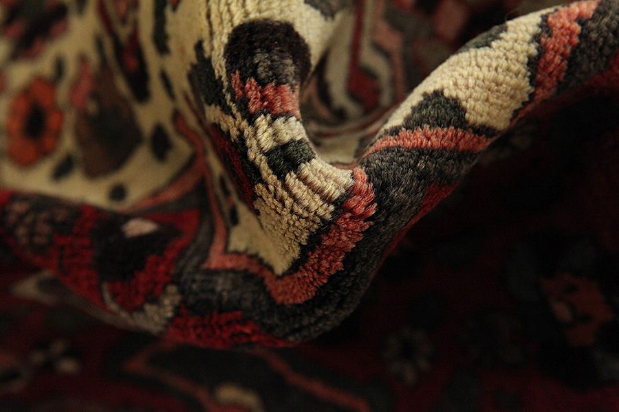 Abrash: Due to the different amount of grease in the wool and the added salt during the process of dyeing, the wool has got a varying colour absorbance. This is not very visible before weaving. During the weaving though, lines of the same colour are formed in the carpet. This is called Abrash (which in Farsi means little cloud) and it shows that the wool was not manufactured using chemical means and marks the naturalness and authenticity of the carpets. Examples