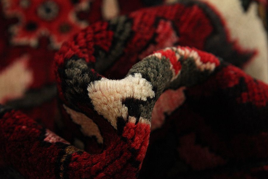 Abrash: Due to the different amount of grease in the wool and the added salt during the process of dyeing, the wool has got a varying colour absorbance. This is not very visible before weaving. During the weaving though, lines of the same colour are formed in the carpet. This is called Abrash (which in Farsi means little cloud) and it shows that the wool was not manufactured using chemical means and marks the naturalness and authenticity of the carpets. Examples