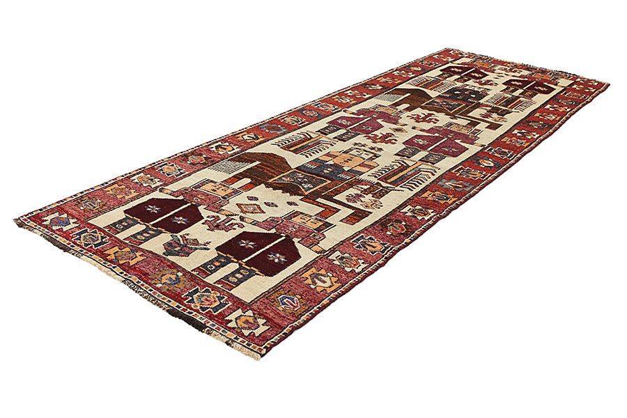 Qashqai Carpets : Qashqai carpets are woven by nomads who live in the mountainous areas of Southwest Persia, the provinces of Fars, Khuzestan, south of Isfahan and around the city Shiraz. Their carpets have a high knot density and a wide variety of designs, usually in deep red and blue colors. They weave carpets, Kilims and decorative textiles (ribbons, bags, etc.), which depict scenes from their lives with various representation of humans, animals, birds, trees and flowers. They also depict historical monuments, mostly from Persepolis.