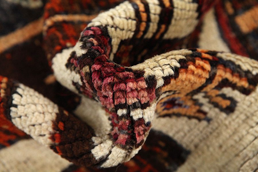 Abrash: Due to the different amount of grease in the wool and the added salt during the process of dyeing, the wool has got a varying colour absorbance. This is not very visible before weaving. During the weaving though, lines of the same colour are formed in the carpet. This is called Abrash (which in Farsi means little cloud) and it shows that the wool was not manufactured using chemical means and marks the naturalness and authenticity of the carpets. Examples