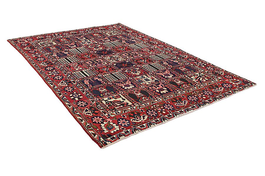 Bakhtiari Carpets : In the mountains Zagros, west of the city of Isfahan, around the town of Shahr-e-Kurd, live the nomads Bakhtiar. Their carpets are known for the design with various repeating squares in which flowers and animals are depicted. For this reason the design is called "garden"(Khesti). Their carpets are very durable with a dense weave and very good quality Persian wool coming from sheep grazing at a high altitude. The best Bakhtiar rugs and carpets with highest knot density are often called Bibibaff. Also in many designs we see influences from Isfahan carpets. (Boldaji - Feridan - Saman).