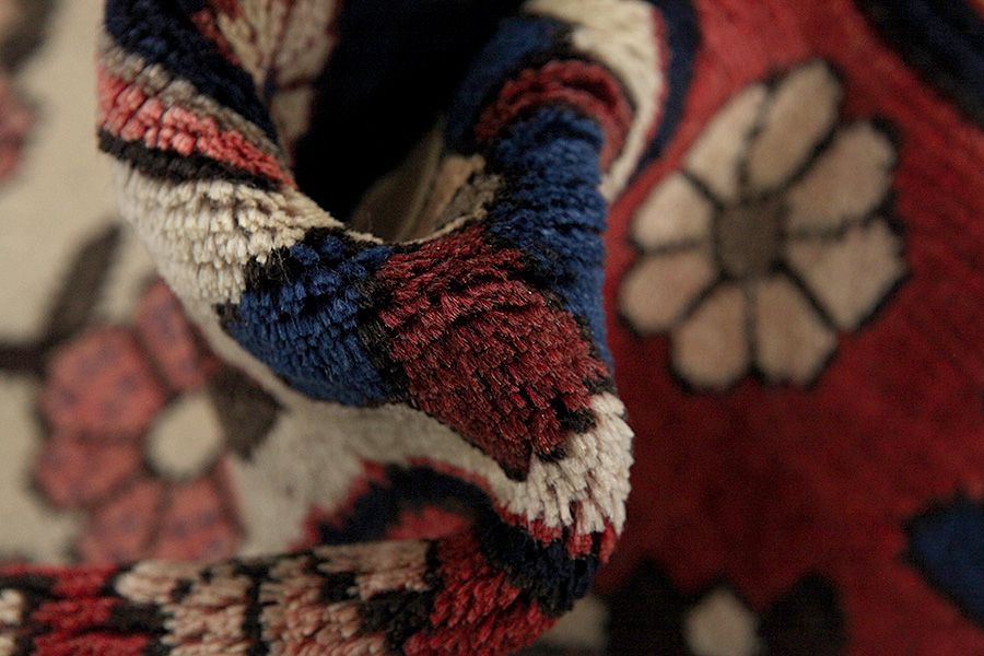 Abrash: Due to the different amount of grease in the wool and the added salt during the process of dyeing, the wool has got a varying colour absorbance. This is not very visible before weaving. During the weaving though, lines of the same colour are formed in the carpet. This is called Abrash (which in Farsi means little cloud) and it shows that the wool was not manufactured using chemical means and marks the naturalness and authenticity of the carpets. Examples