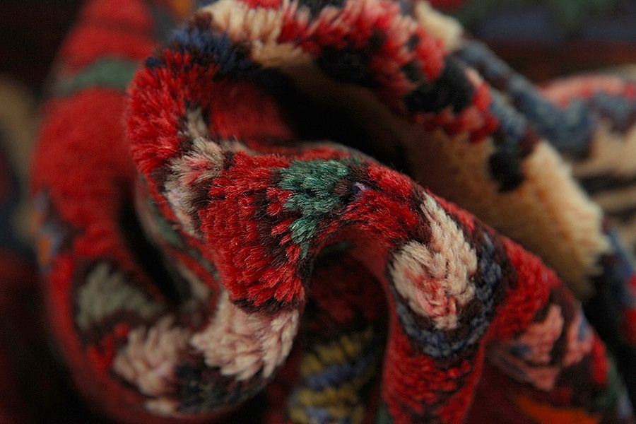 Abrash: Due to the different amount of grease in the wool and the added salt during the process of dyeing, the wool has got a varying colour absorbance. This is not very visible before weaving. During the weaving though, lines of the same colour are formed in the carpet. This is called Abrash (which in Farsi means little cloud) and it shows that the wool was not manufactured using chemical means and marks the naturalness and authenticity of the carpets. Examples
