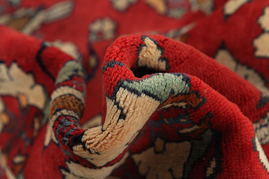 Abrash: Due to the different amount of grease in the wool and the added salt during the process of dyeing, the wool has got a varying colour absorbance. This is not very visible before weaving. During the weaving though, lines of the same colour are formed in the carpet. This is called Abrash (which in Farsi means little cloud) and it shows that the wool was not manufactured using chemical means and marks the naturalness and authenticity of the carpets. Examples