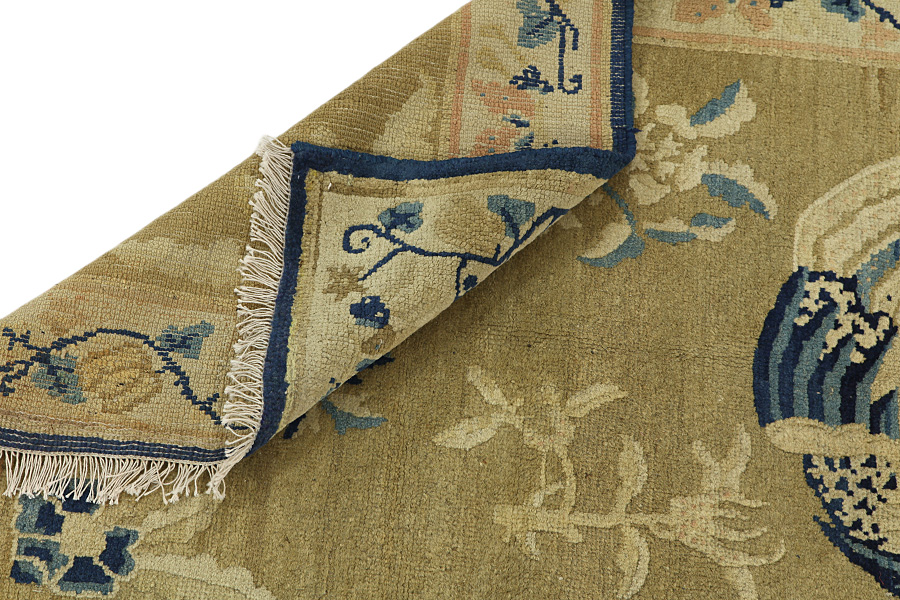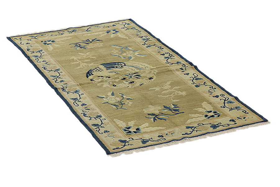 Khotan Carpets : Handwoven in or about the ancient city of Khotan (Hotan) in the southern Uygur Autonomous Region of Xinjiang (Chinese Turkistan). They combine Chinese details with Central Asian design schemes and Western vivid coloring, except where recent fugitive dyes have reduced their effect to washed-out pastels. Khotan carpets with woolen pile have cotton warp and mixed-color wool or cotton weft and are usually made with the asymmetrical knot. Field colors may be blue, yellow, or white, aswell as the usual red.