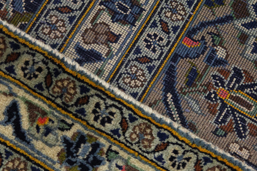 Abrash: Due to the different amount of grease in the wool and the added salt during the process of dyeing, the wool has got a varying colour absorbance. This is not very visible before weaving. During the weaving though, lines of the same colour are formed in the carpet. This is called Abrash (which in Farsi means little cloud) and it shows that the wool was not manufactured using chemical means and marks the naturalness and authenticity of the carpets. Examples