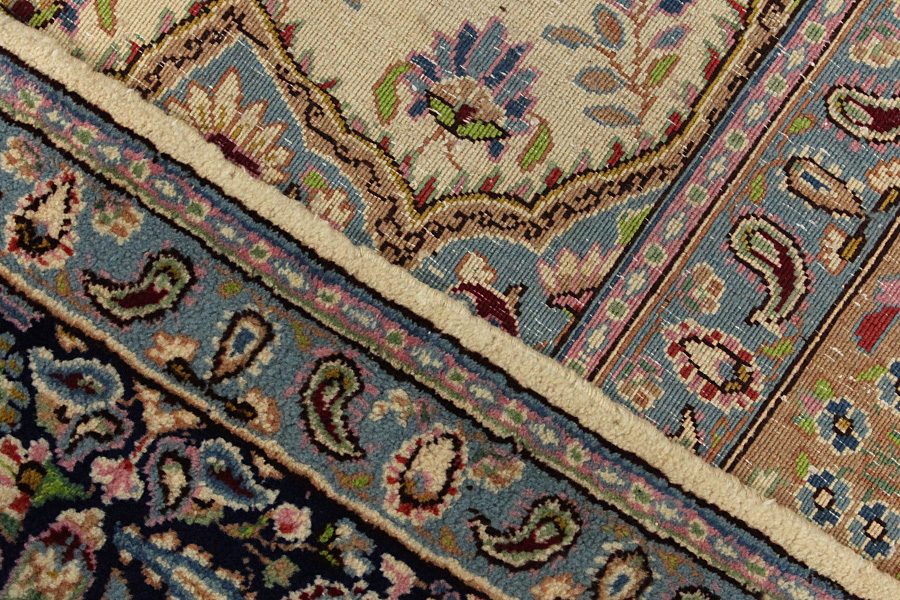 Abrash: Due to the different amount of grease in the wool and the added salt during the process of dyeing, the wool has got a varying colour absorbance. This is not very visible before weaving. During the weaving though, lines of the same colour are formed in the carpet. This is called Abrash (which in Farsi means little cloud) and it shows that the wool was not manufactured using chemical means and marks the naturalness and authenticity of the carpets. Examples