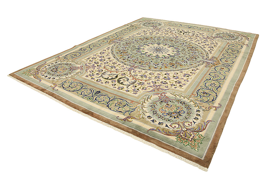 Isfahan Carpets : In the centre of Iran among the Zagros Mountains and the desert, lies the city of Isfahan. Nowadays it is an important industrial city with a population of 1.2 million. The town is an architectural masterpiece. The old carpets of Isfahan in contrast with the newer ones didn't have got a central medallion. The entire surface of the carpet was filled with elaborate spiral flowers and flower palmettes. The newer Isfahan rugs and carpets cannot be compared with those wonderful old specimens which were manufactured exclusively for nobles. But continuing the tradition, today's carpets of Isfahan also have a very fine weave and are clipped very short to reveal their design more clearly. In the weaving they also use silk to highlight certain areas of the design, especially in flowers. The warp is made of silk or cotton.