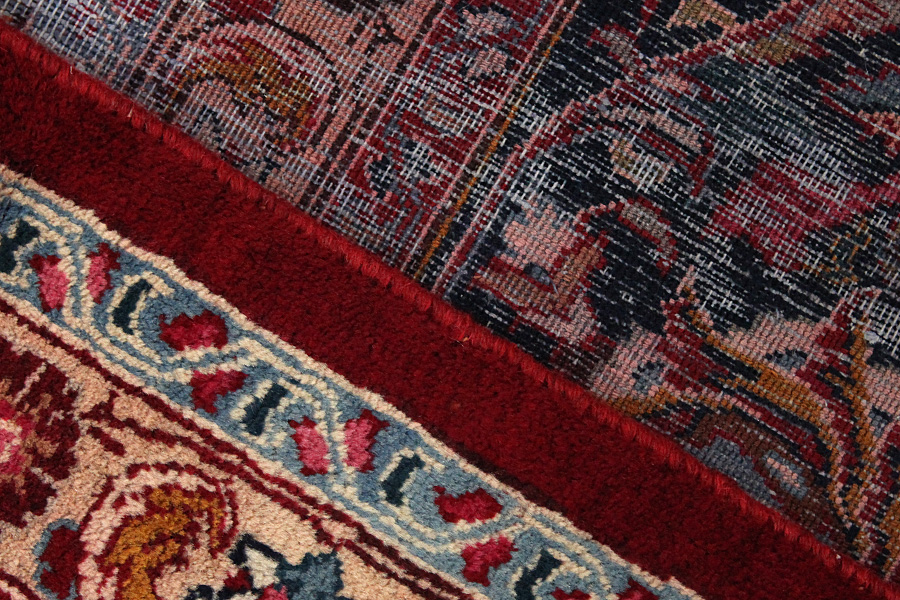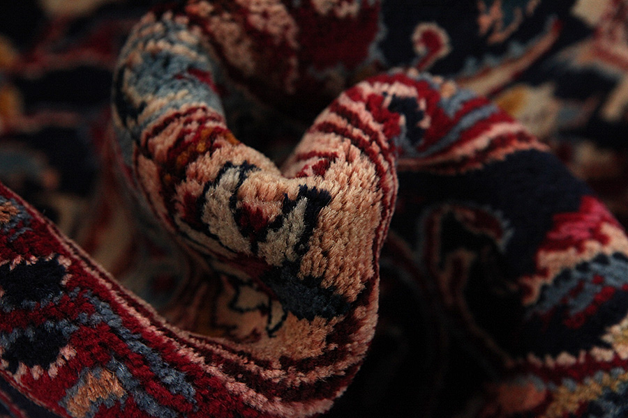 Abrash: Due to the different amount of grease in the wool and the added salt during the process of dyeing, the wool has got a varying colour absorbance. This is not very visible before weaving. During the weaving though, lines of the same colour are formed in the carpet. This is called Abrash (which in Farsi means little cloud) and it shows that the wool was not manufactured using chemical means and marks the naturalness and authenticity of the carpets. Examples