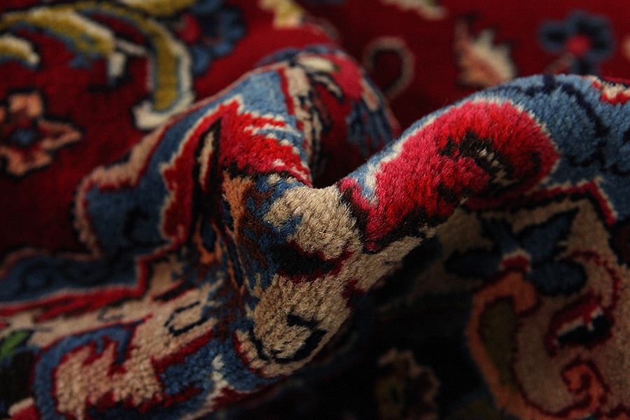 Abrash: Due to the different amount of grease in the wool and the added salt during the process of dyeing, the wool has got a varying colour absorbance. This is not very visible before weaving. During the weaving though, lines of the same colour are formed in the carpet. This is called Abrash (which in Farsi means little cloud) and it shows that the wool was not manufactured using chemical means and marks the naturalness and authenticity of the carpets. Examples