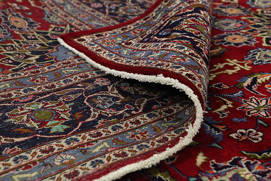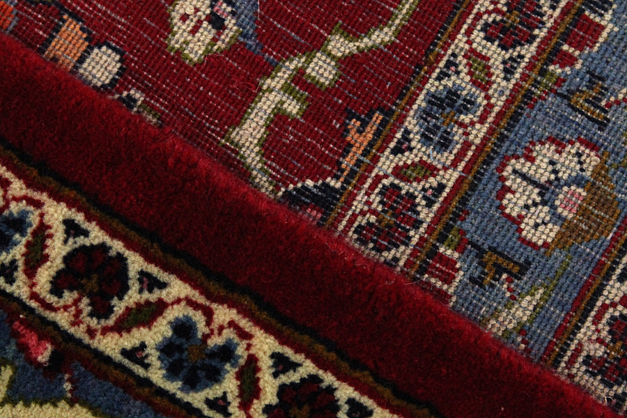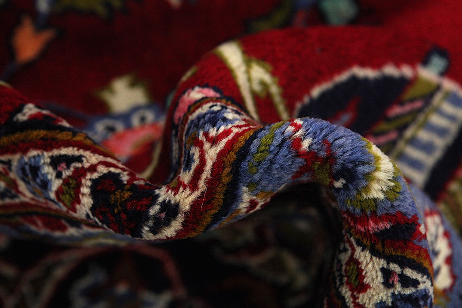 Abrash: Due to the different amount of grease in the wool and the added salt during the process of dyeing, the wool has got a varying colour absorbance. This is not very visible before weaving. During the weaving though, lines of the same colour are formed in the carpet. This is called Abrash (which in Farsi means little cloud) and it shows that the wool was not manufactured using chemical means and marks the naturalness and authenticity of the carpets. Examples