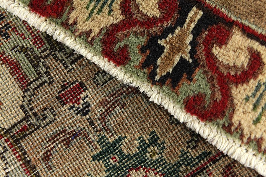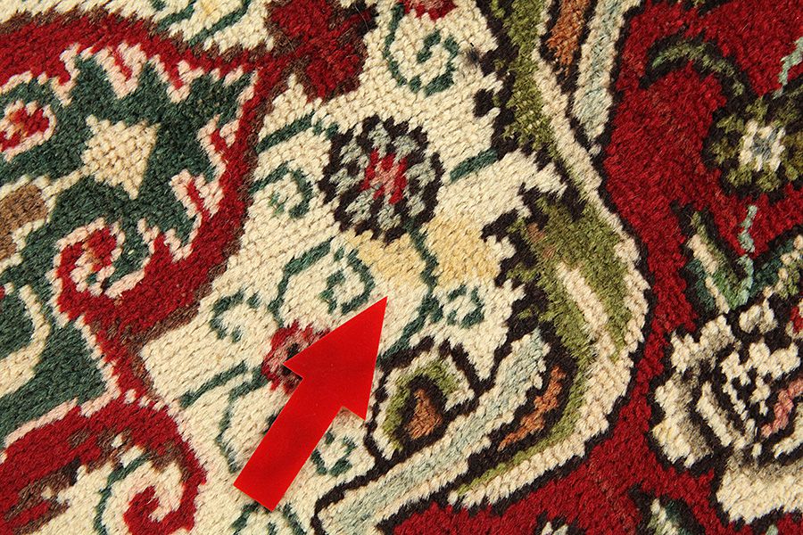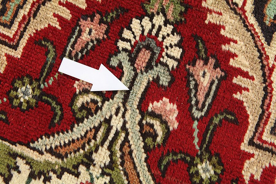 Abrash: Due to the different amount of grease in the wool and the added salt during the process of dyeing, the wool has got a varying colour absorbance. This is not very visible before weaving. During the weaving though, lines of the same colour are formed in the carpet. This is called Abrash (which in Farsi means little cloud) and it shows that the wool was not manufactured using chemical means and marks the naturalness and authenticity of the carpets. Examples