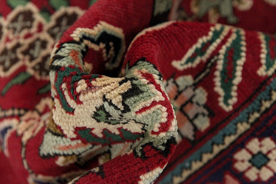 Abrash: Due to the different amount of grease in the wool and the added salt during the process of dyeing, the wool has got a varying colour absorbance. This is not very visible before weaving. During the weaving though, lines of the same colour are formed in the carpet. This is called Abrash (which in Farsi means little cloud) and it shows that the wool was not manufactured using chemical means and marks the naturalness and authenticity of the carpets. Examples