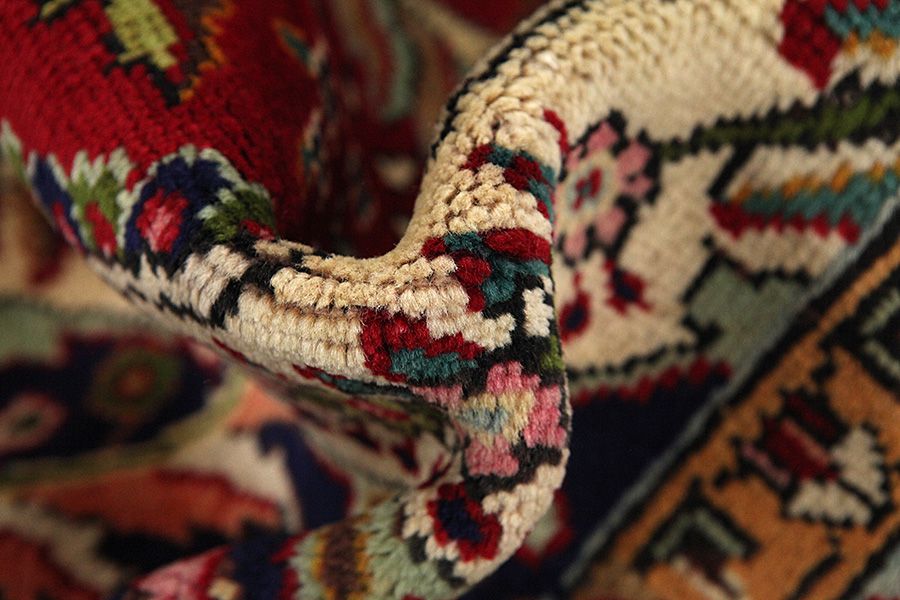 Abrash: Due to the different amount of grease in the wool and the added salt during the process of dyeing, the wool has got a varying colour absorbance. This is not very visible before weaving. During the weaving though, lines of the same colour are formed in the carpet. This is called Abrash (which in Farsi means little cloud) and it shows that the wool was not manufactured using chemical means and marks the naturalness and authenticity of the carpets. Examples