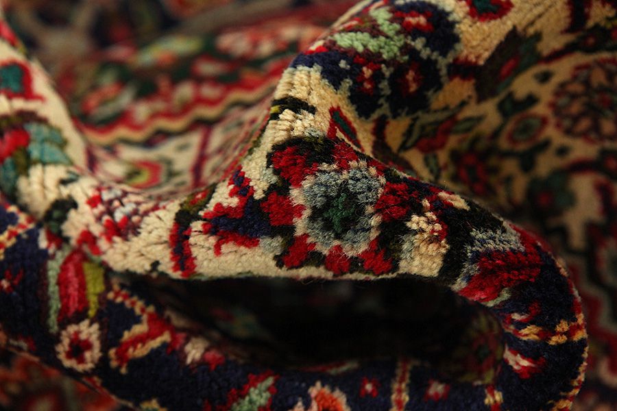 Abrash: Due to the different amount of grease in the wool and the added salt during the process of dyeing, the wool has got a varying colour absorbance. This is not very visible before weaving. During the weaving though, lines of the same colour are formed in the carpet. This is called Abrash (which in Farsi means little cloud) and it shows that the wool was not manufactured using chemical means and marks the naturalness and authenticity of the carpets. Examples