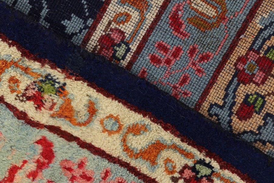 Abrash: Due to the different amount of grease in the wool and the added salt during the process of dyeing, the wool has got a varying colour absorbance. This is not very visible before weaving. During the weaving though, lines of the same colour are formed in the carpet. This is called Abrash (which in Farsi means little cloud) and it shows that the wool was not manufactured using chemical means and marks the naturalness and authenticity of the carpets. Examples