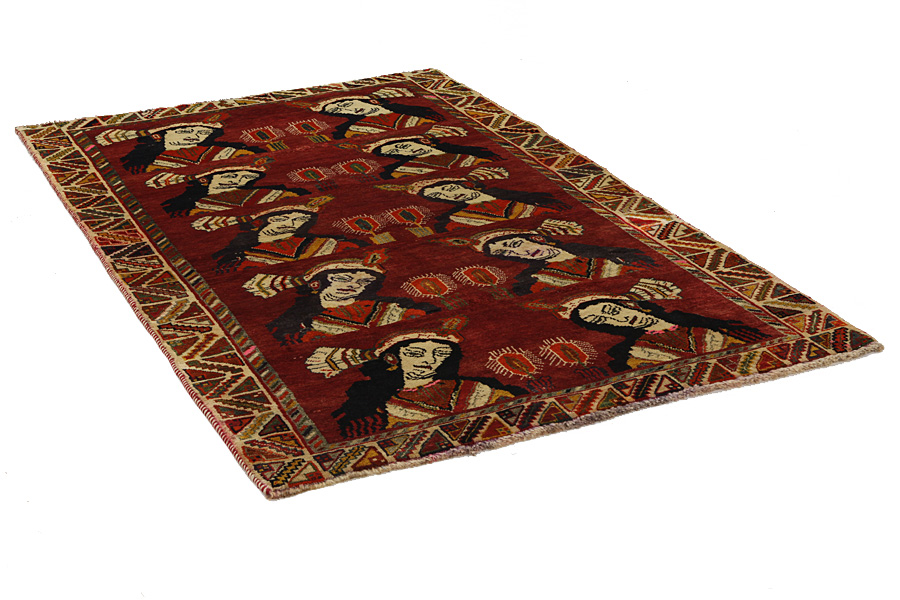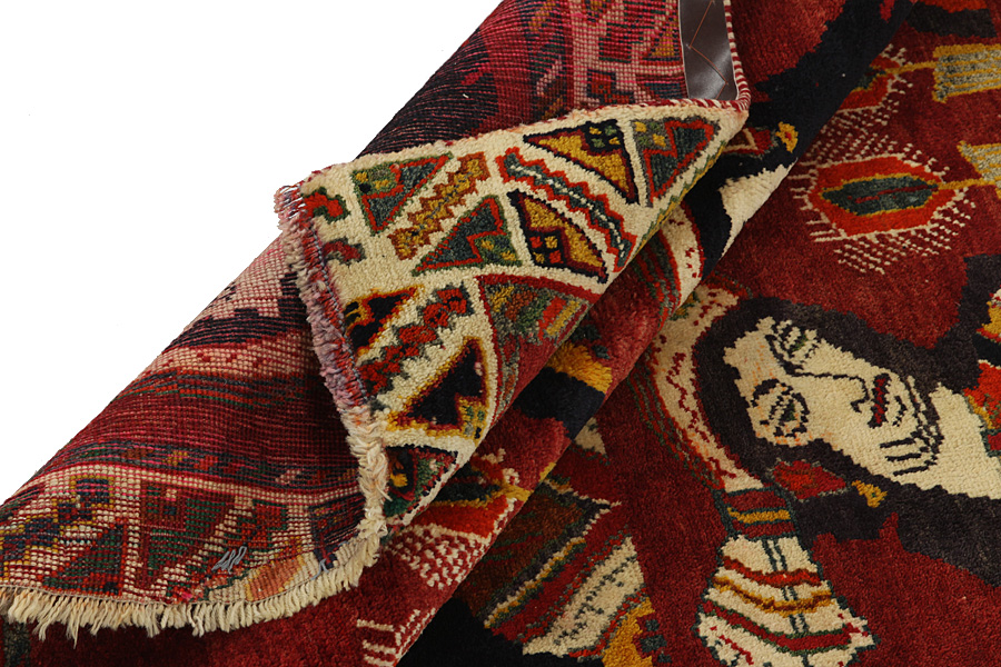 Qashqai Carpets : Qashqai carpets are woven by nomads who live in the mountainous areas of Southwest Persia, the provinces of Fars, Khuzestan, south of Isfahan and around the city Shiraz. Their carpets have a high knot density and a wide variety of designs, usually in deep red and blue colors. They weave carpets, Kilims and decorative textiles (ribbons, bags, etc.), which depict scenes from their lives with various representation of humans, animals, birds, trees and flowers. They also depict historical monuments, mostly from Persepolis.