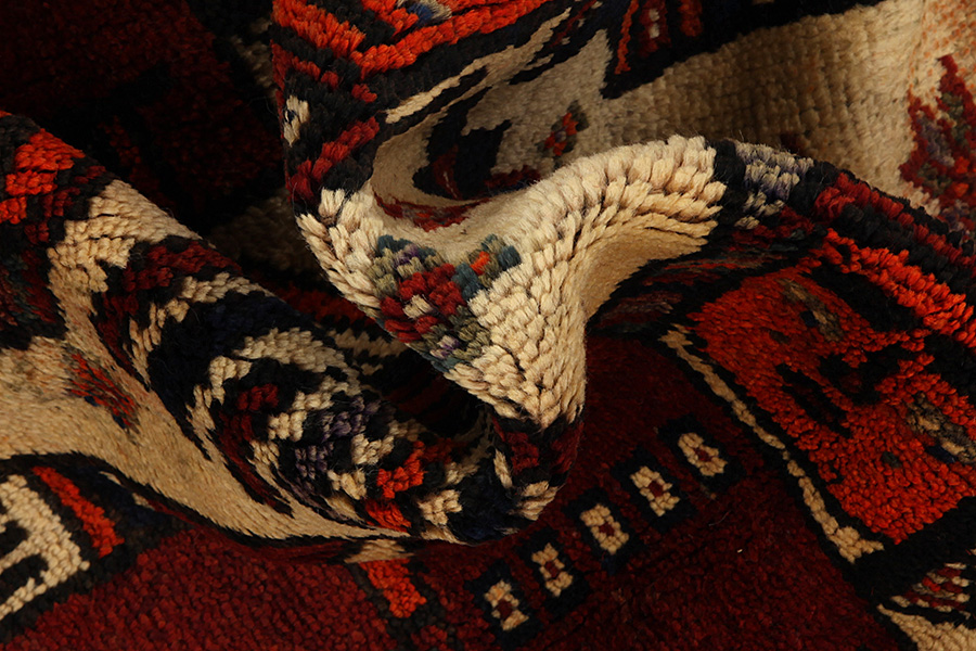 Qashqai Carpets : Qashqai carpets are woven by nomads who live in the mountainous areas of Southwest Persia, the provinces of Fars, Khuzestan, south of Isfahan and around the city Shiraz. Their carpets have a high knot density and a wide variety of designs, usually in deep red and blue colors. They weave carpets, Kilims and decorative textiles (ribbons, bags, etc.), which depict scenes from their lives with various representation of humans, animals, birds, trees and flowers. They also depict historical monuments, mostly from Persepolis.