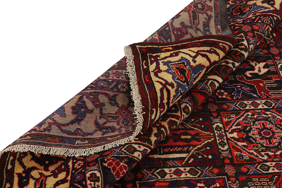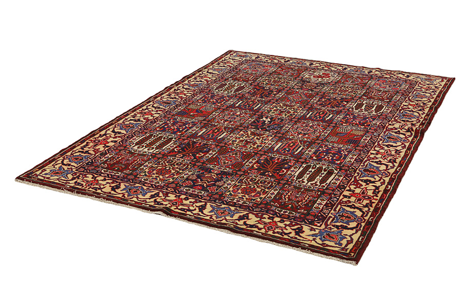 Bakhtiari Carpets : In the mountains Zagros, west of the city of Isfahan, around the town of Shahr-e-Kurd, live the nomads Bakhtiar. Their carpets are known for the design with various repeating squares in which flowers and animals are depicted. For this reason the design is called "garden"(Khesti). Their carpets are very durable with a dense weave and very good quality Persian wool coming from sheep grazing at a high altitude. The best Bakhtiar rugs and carpets with highest knot density are often called Bibibaff. Also in many designs we see influences from Isfahan carpets. (Boldaji - Feridan - Saman).