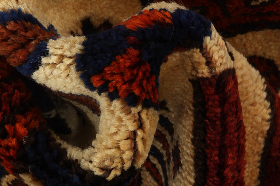 Abrash: Due to the different amount of grease in the wool and the added salt during the process of dyeing, the wool has got a varying colour absorbance. This is not very visible before weaving. During the weaving though, lines of the same colour are formed in the carpet. This is called Abrash (which in Farsi means little cloud) and it shows that the wool was not manufactured using chemical means and marks the naturalness and authenticity of the carpets. Examples