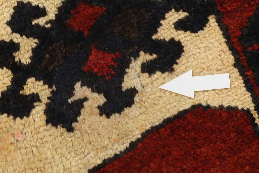 Abrash: Due to the different amount of grease in the wool and the added salt during the process of dyeing, the wool has got a varying colour absorbance. This is not very visible before weaving. During the weaving though, lines of the same colour are formed in the carpet. This is called Abrash (which in Farsi means little cloud) and it shows that the wool was not manufactured using chemical means and marks the naturalness and authenticity of the carpets. Examples