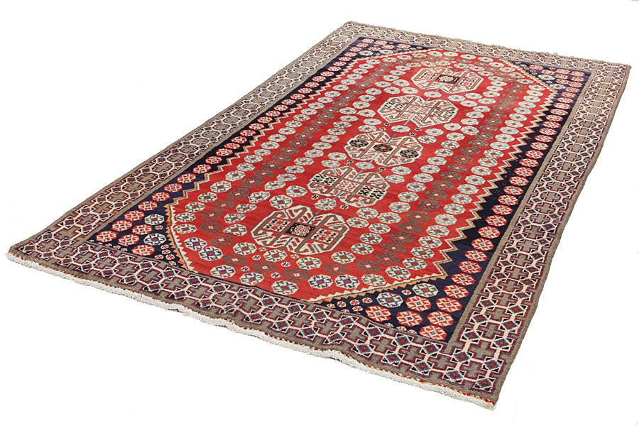 Qashqai Carpets : Qashqai carpets are woven by nomads who live in the mountainous areas of Southwest Persia, the provinces of Fars, Khuzestan, south of Isfahan and around the city Shiraz. Their carpets have a high knot density and a wide variety of designs, usually in deep red and blue colors. They weave carpets, Kilims and decorative textiles (ribbons, bags, etc.), which depict scenes from their lives with various representation of humans, animals, birds, trees and flowers. They also depict historical monuments, mostly from Persepolis.