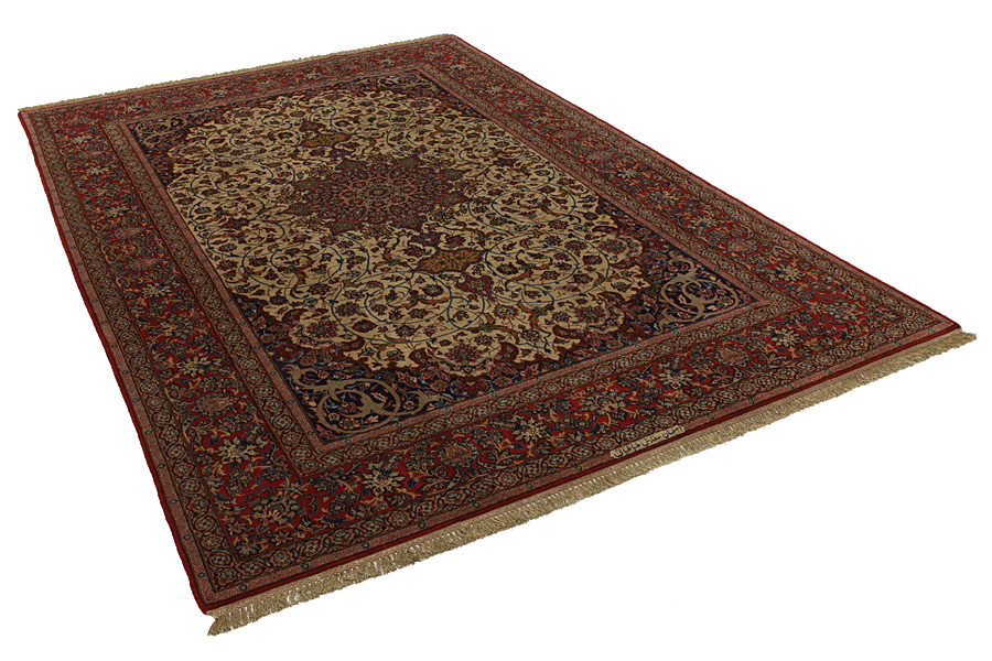 Isfahan Carpets : In the centre of Iran among the Zagros Mountains and the desert, lies the city of Isfahan. Nowadays it is an important industrial city with a population of 1.2 million. The town is an architectural masterpiece. The old carpets of Isfahan in contrast with the newer ones didn't have got a central medallion. The entire surface of the carpet was filled with elaborate spiral flowers and flower palmettes. The newer Isfahan rugs and carpets cannot be compared with those wonderful old specimens which were manufactured exclusively for nobles. But continuing the tradition, today's carpets of Isfahan also have a very fine weave and are clipped very short to reveal their design more clearly. In the weaving they also use silk to highlight certain areas of the design, especially in flowers. The warp is made of silk or cotton.