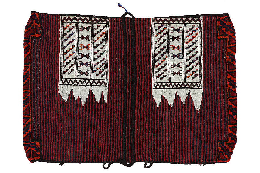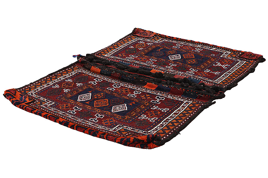 Saddle Bag Carpets : ​Horse saddle bags are made by Nomads for their own use. One can distinguish between the kilim-horse saddle bags and the knotted horse saddle bags. The front side of a knotted horse saddle bag is either knotted like a common carpet with knots or different mixed techniques are used. The side parts are often woven whereas in the middle part different weaving techniques such as kelim or Soumak are applied. The colors horse bags are dyed with are all natural and made by the Nomads themselves. Bags like these once carried everyday necessities for travelers on donkeys or horses. A delightful piece of art that provides a unique oriental atmosphere to your home. Horse saddle bags can be used as a seat cushion, as a floor cushion eg in front of your fireplace or as a wall decoration. Smaller horse saddle bags can be used as a newspaper holder to store newspapers or magazines when slung over a chair or sofa.