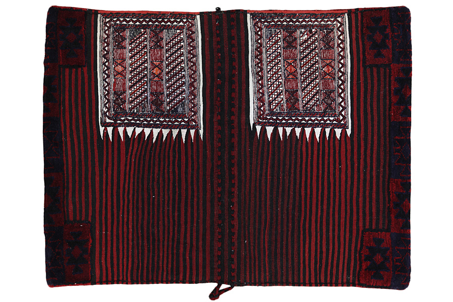 Saddle Bag Carpets : ​Horse saddle bags are made by Nomads for their own use. One can distinguish between the kilim-horse saddle bags and the knotted horse saddle bags. The front side of a knotted horse saddle bag is either knotted like a common carpet with knots or different mixed techniques are used. The side parts are often woven whereas in the middle part different weaving techniques such as kelim or Soumak are applied. The colors horse bags are dyed with are all natural and made by the Nomads themselves. Bags like these once carried everyday necessities for travelers on donkeys or horses. A delightful piece of art that provides a unique oriental atmosphere to your home. Horse saddle bags can be used as a seat cushion, as a floor cushion eg in front of your fireplace or as a wall decoration. Smaller horse saddle bags can be used as a newspaper holder to store newspapers or magazines when slung over a chair or sofa.