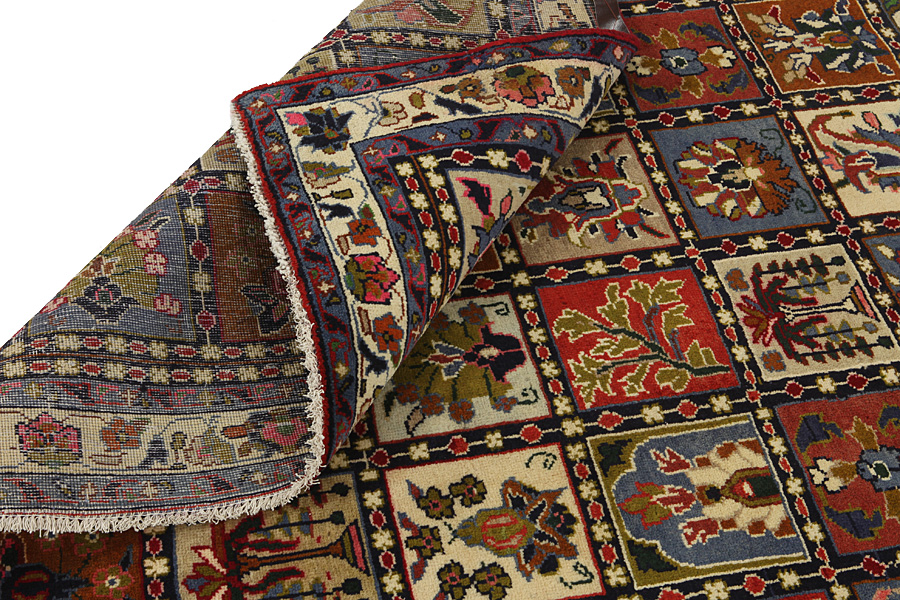 Bakhtiari Carpets : In the mountains Zagros, west of the city of Isfahan, around the town of Shahr-e-Kurd, live the nomads Bakhtiar. Their carpets are known for the design with various repeating squares in which flowers and animals are depicted. For this reason the design is called "garden"(Khesti). Their carpets are very durable with a dense weave and very good quality Persian wool coming from sheep grazing at a high altitude. The best Bakhtiar rugs and carpets with highest knot density are often called Bibibaff. Also in many designs we see influences from Isfahan carpets. (Boldaji - Feridan - Saman).