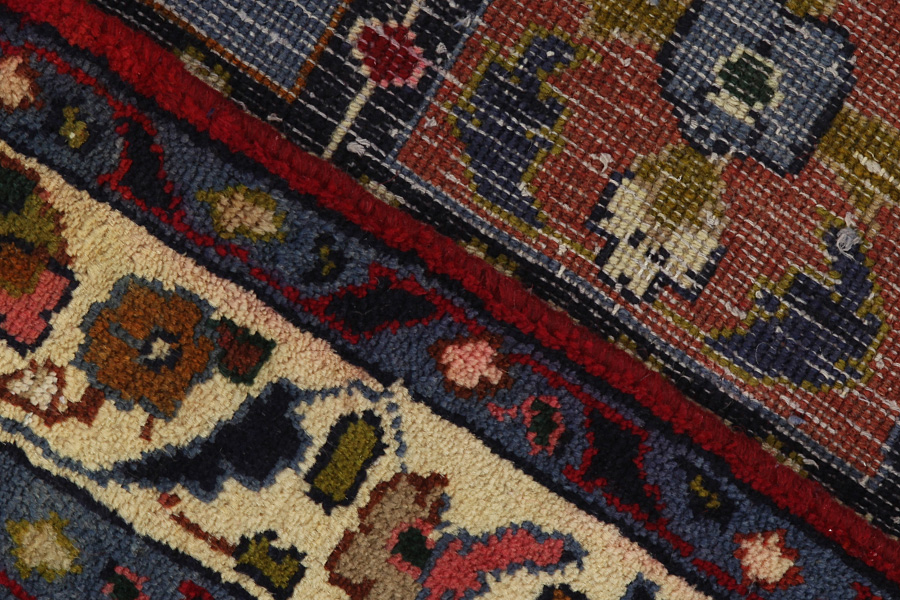 Abrash: Due to the different amount of grease in the wool and the added salt during the process of dyeing, the wool has got a varying colour absorbance. This is not very visible before weaving. During the weaving though, lines of the same colour are formed in the carpet. This is called Abrash (which in Farsi means little cloud) and it shows that the wool was not manufactured using chemical means and marks the naturalness and authenticity of the carpets. Examples